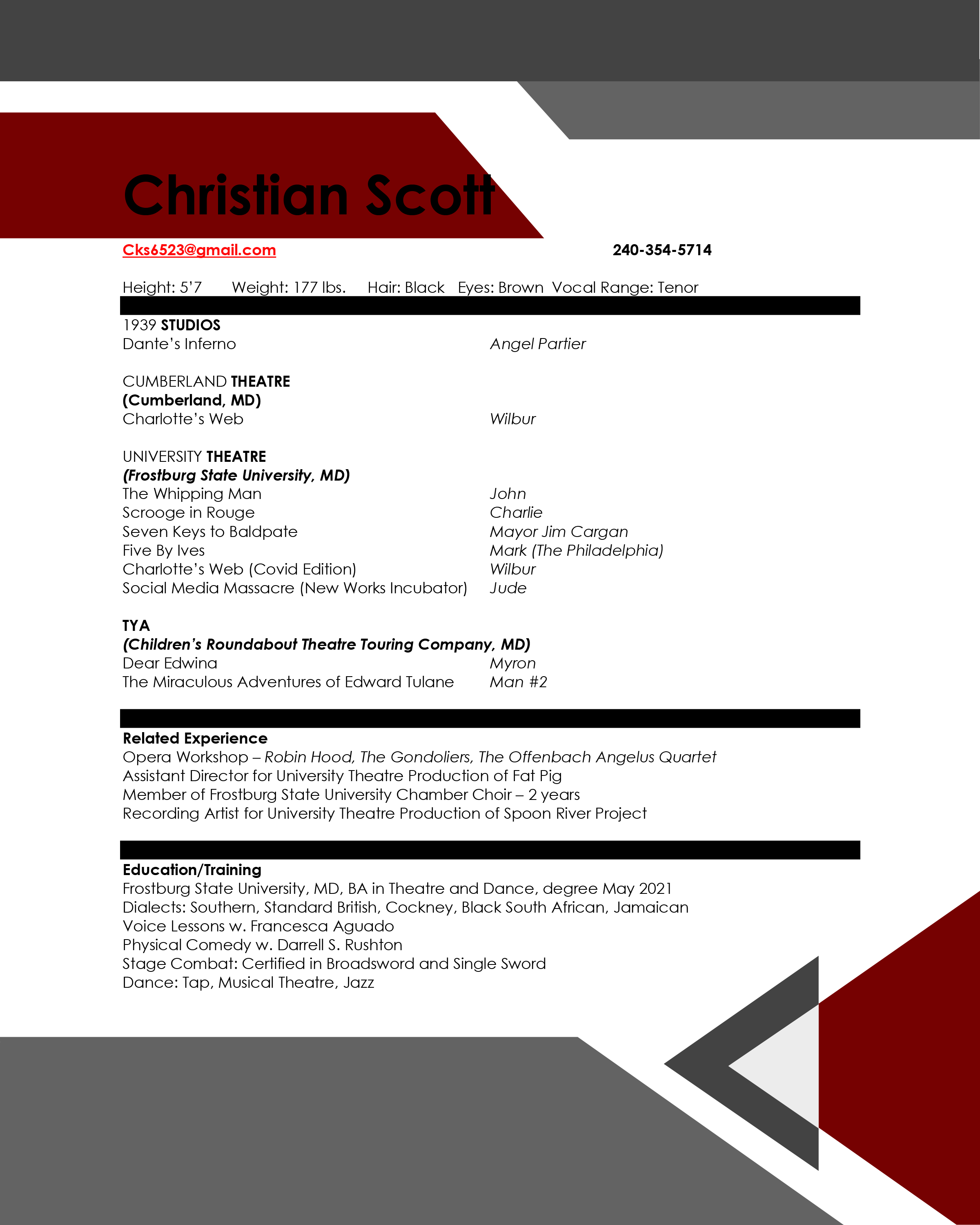 Christian Scott has recently graduated from Frostburg State University in Spring 2021 with a Bachelor’s Degree in Theatre and a minor in Musical Theatre. He started acting in high school and has loved it ever since.
